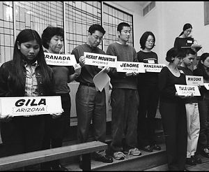 Japanese Americans hold signs representing each of the 10 World War II-era Japanese American concentration camps.